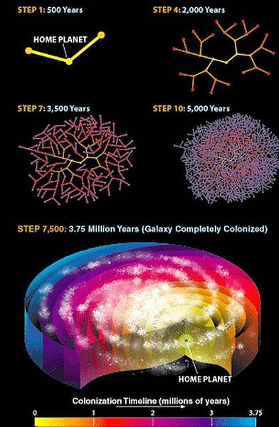 譯註:這張圖源自費米悖論。費米發現任何擁有現代火箭科技和具體殖民計劃的文明都可以在數百萬年內將殖民範圍拓展到整個銀河系。